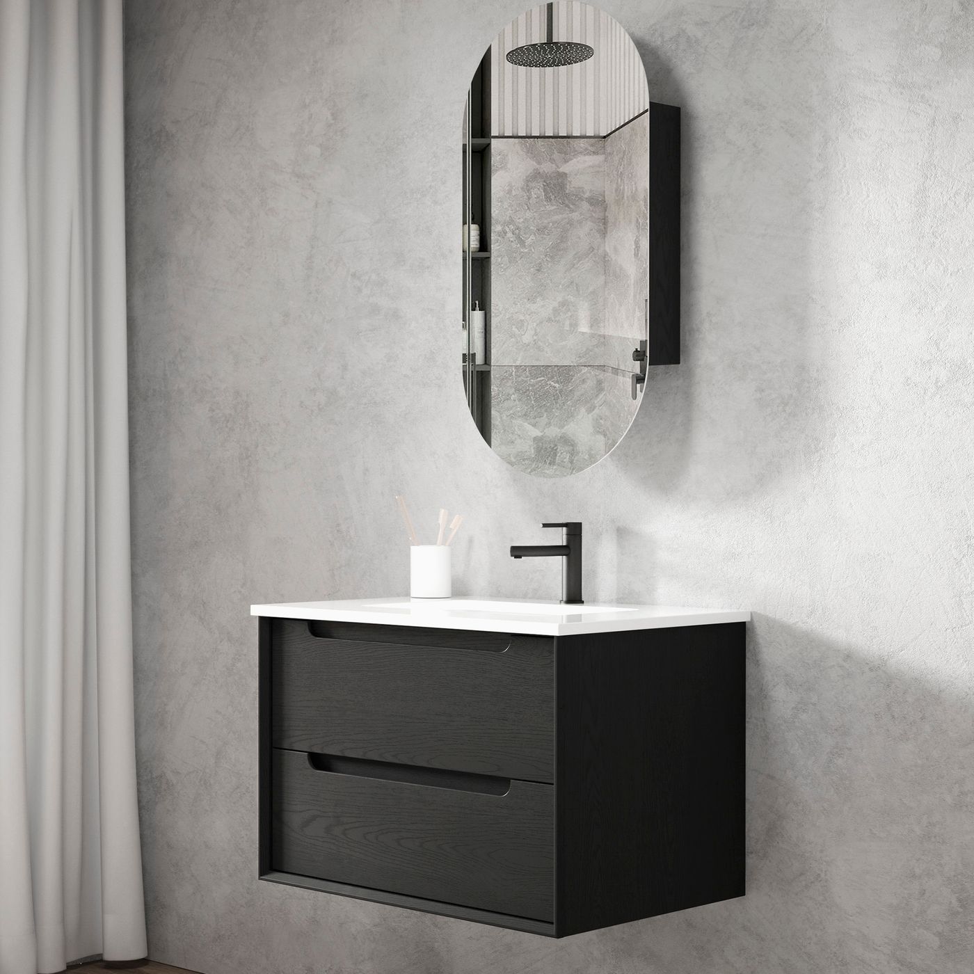 • Byron 750mm Black Oak Wall Hung Vanity with Ceramic Top