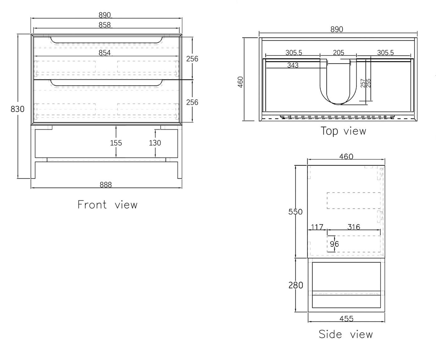 Dimensions 890x460x550mm