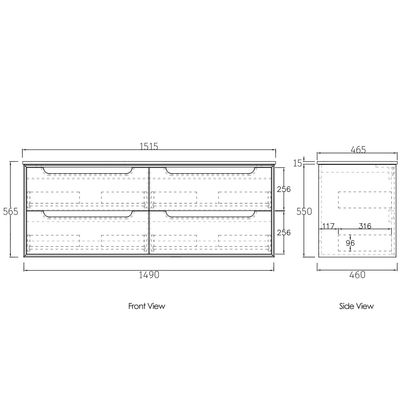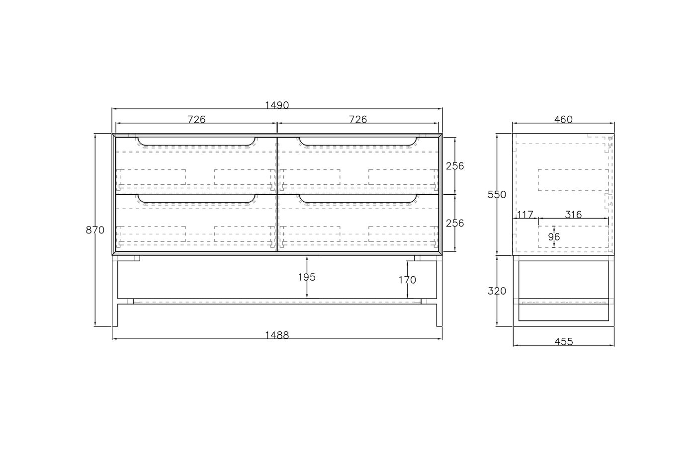 Dimensions 1490x460x550mm