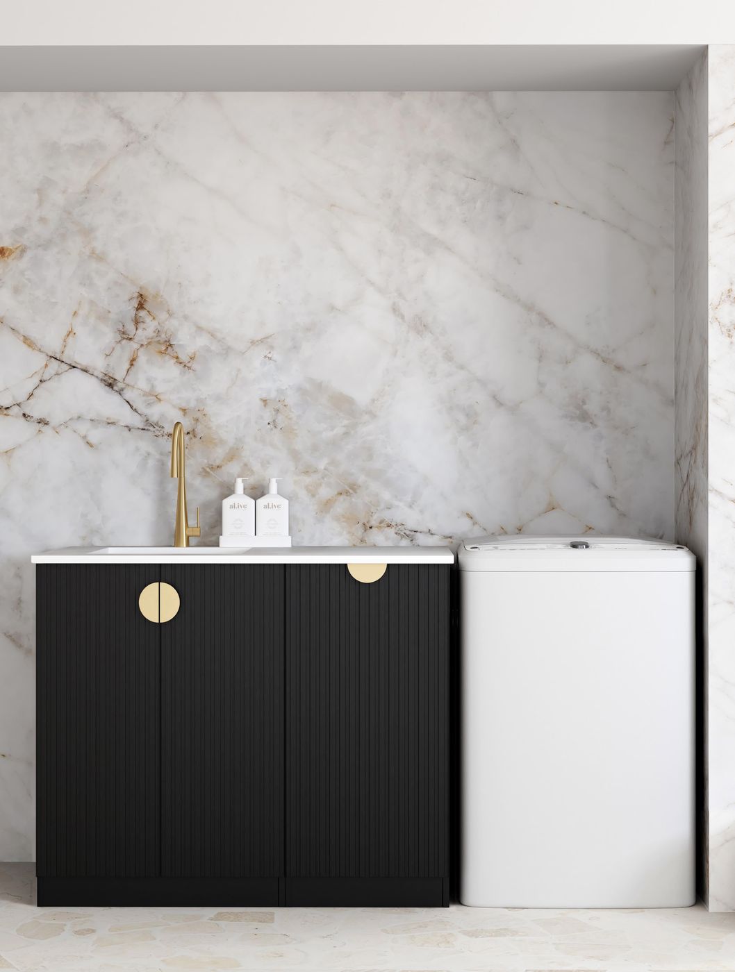 Marlo Black Base Laundry Cabinet with 1060mm Cloudy Carrara Top