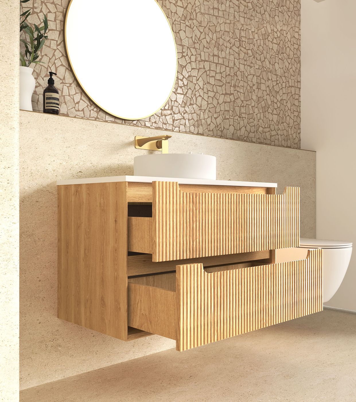The Byron vanity features a natural oak finish, high moisture resistant plywood construction, soft edge finger pull handles, and Hettich hinges and runners for smooth and soft closing. The new Fluted veneer showcases detailed fine lines that add elegance to you designer bathroom.