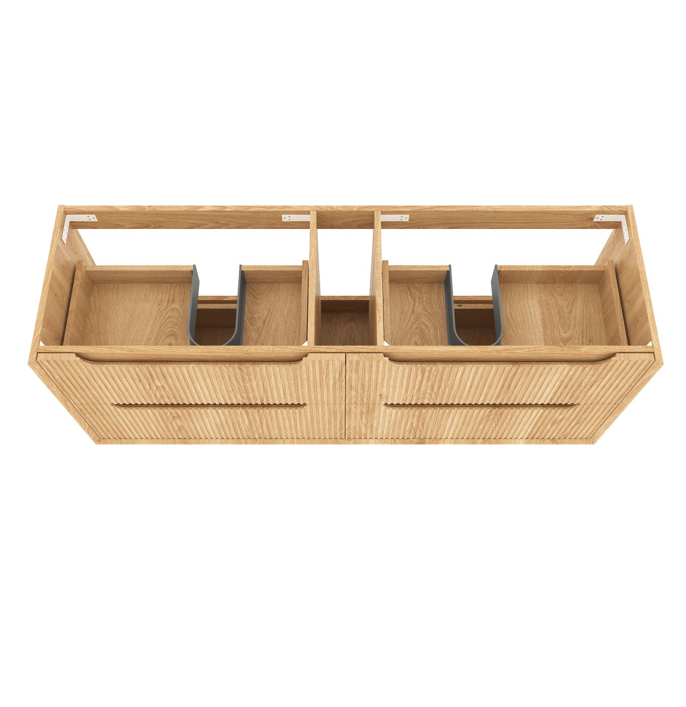 The Byron vanity features a natural oak finish, high moisture resistant plywood construction, soft edge finger pull handles, and Hettich hinges and runners for smooth and soft closing. The new Fluted veneer showcases detailed fine lines that add elegance to you designer bathroom.