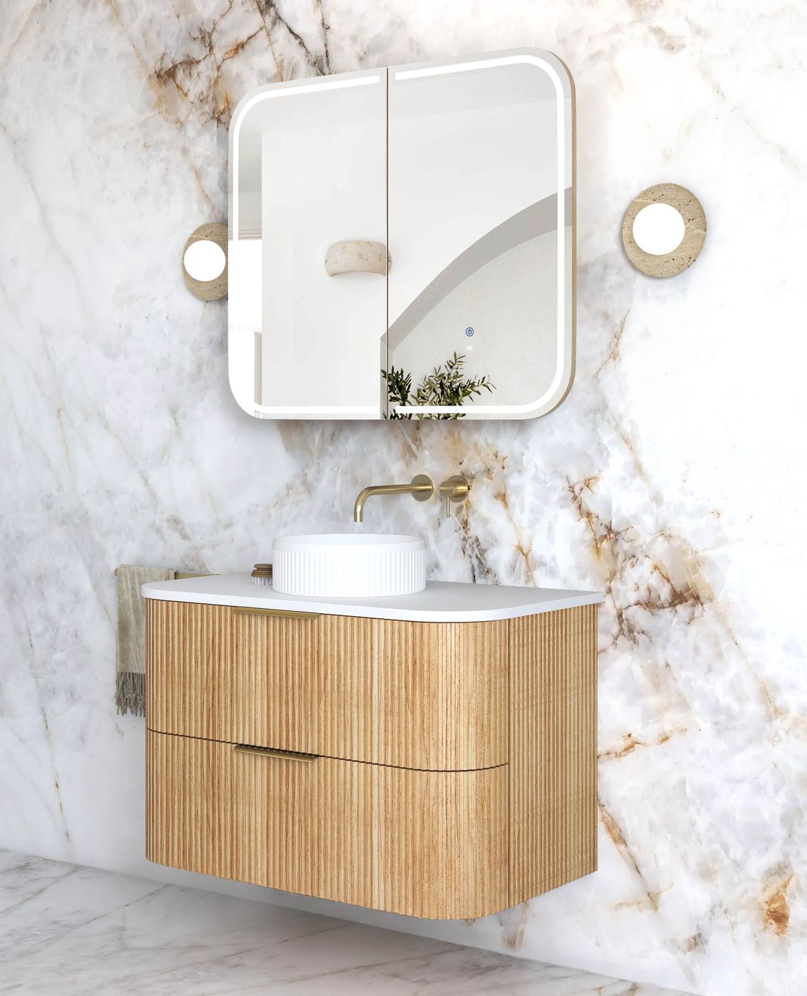 Havana 900mm Woodland Oak Fluted Wall Hung Curve Vanity with Cloudy Carrara Top