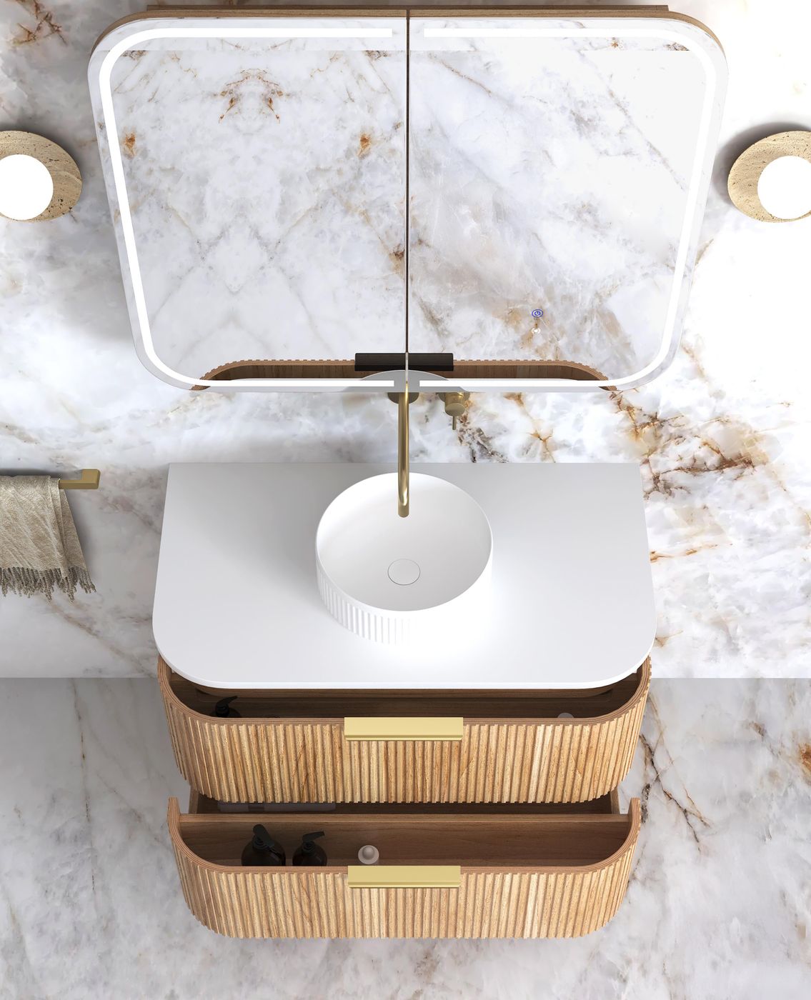 • Havana 900mm Woodland Oak Fluted Wall Hung Curve Vanity with Sand Dune Top